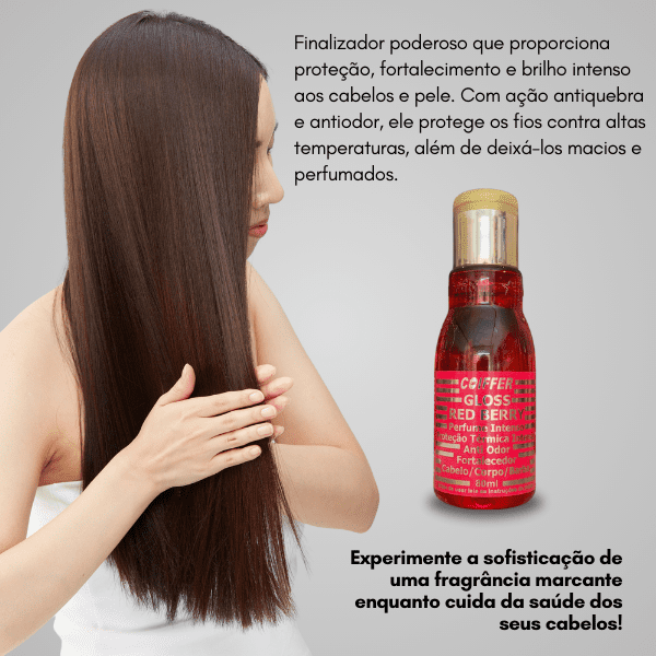 O Gloss Red Berry Coiffer 80ml é um finalizador capilar multifuncional que fortalece os fios, reduz a quebra e oferece proteção térmica avançada. Sua fórmula inovadora cria uma película protetora, evitando danos causados pelo calor da chapinha e do secador. Além disso, combate odores indesejáveis, deixando os cabelos e a pele com um toque fresco e agradável. Com propriedades reparadoras, esse gloss capilar proporciona brilho reflexivo, nutrição intensa e fios mais saudáveis todos os dias.