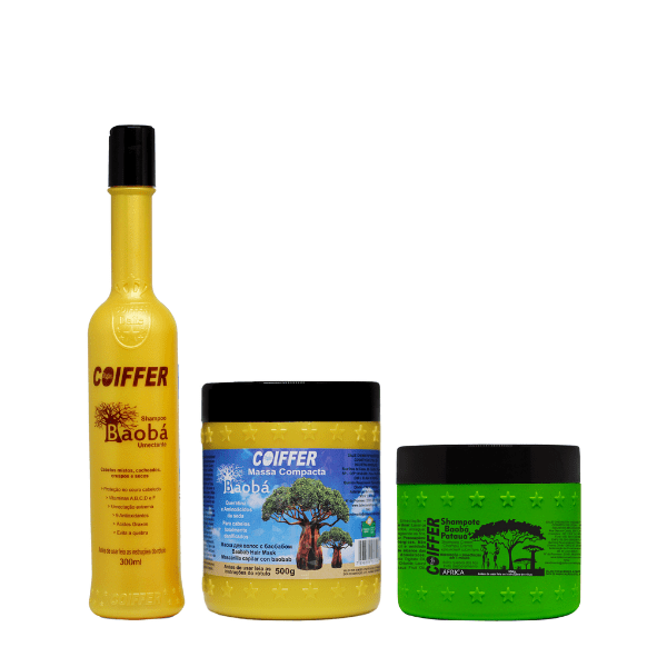 O Kit Baobá Coiffer de tratamento para Clientes que devolve a umidade natural dos fios, deixando-os hidratados e com brilho, evitando as quebras e dando proteção ao couro Cabeludo (Protege contra a Ação das Químicas). Ele é perfeito para cabelos mistos, cacheados, crespos.
