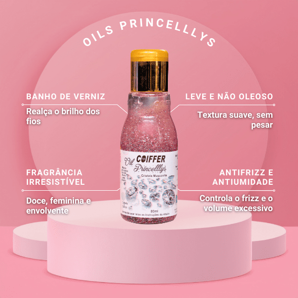 O Óleo Princelllys Coiffer tem a finalidade doar brilho e banho de verniz nos cabelos.